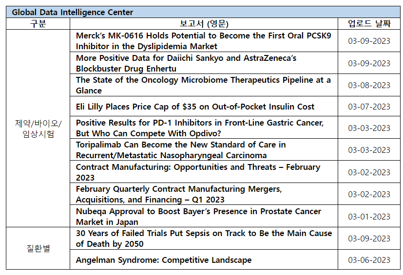 | 제약/바이오/임상시험 | Merck’s MK-0616 Holds Potential to Become the First Oral PCSK9 Inhibitor in the Dyslipidemia Market | 03-09-2023 |