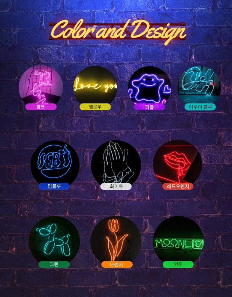 네온사인도 색상이 빨간색, 주황색, 노란색, 연두색, 초록색, 파란색, 아쿠아블루, 보라색, 핑크색, 화이트까지