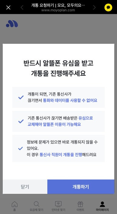카톡에 온 배송 완료 톡에서 개통 요청하기를 누르면 시작이 되요~