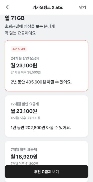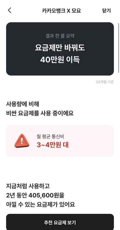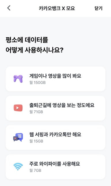 카카오 뱅크 X 모요에서는 알뜰폰 요금제중에서 나에게 맞는 요금제를 골라주는 광고였어요~