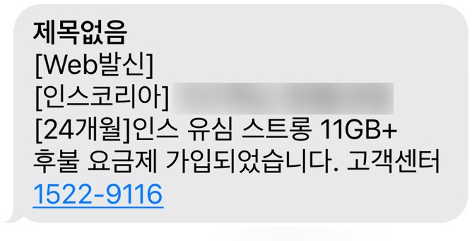 개통이 완료되면 이렇게 인스 유심 스트롱 11GB+에 가입되었다고 알림문자가 왔어요~