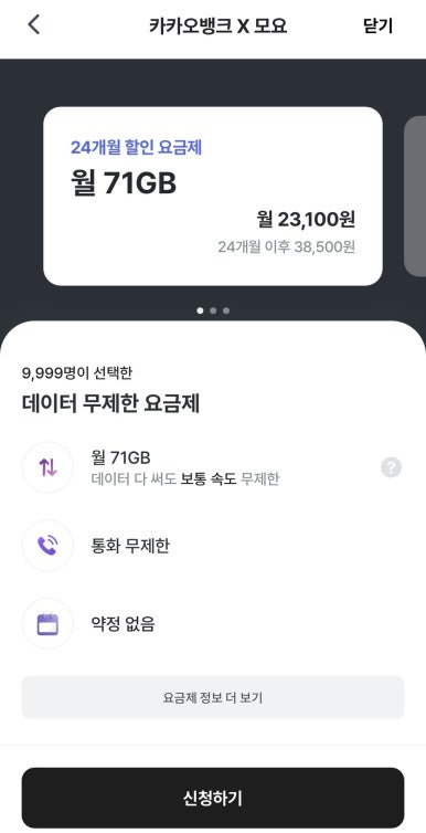 요금제는 11G + 무제한 요금제 (한달 23700원)였지만 2년이 지나는 시점에서 할인되던 금액이 32100원으로 원래대로 올랐어요 ~ 그러다가 최근 우연히 카카오뱅크 알림톡으로 카카오뱅크 X 모요 라는 광고를 봤고 저렴한 요금제가 없을까 찾던 중에 눌러보게 되었어요