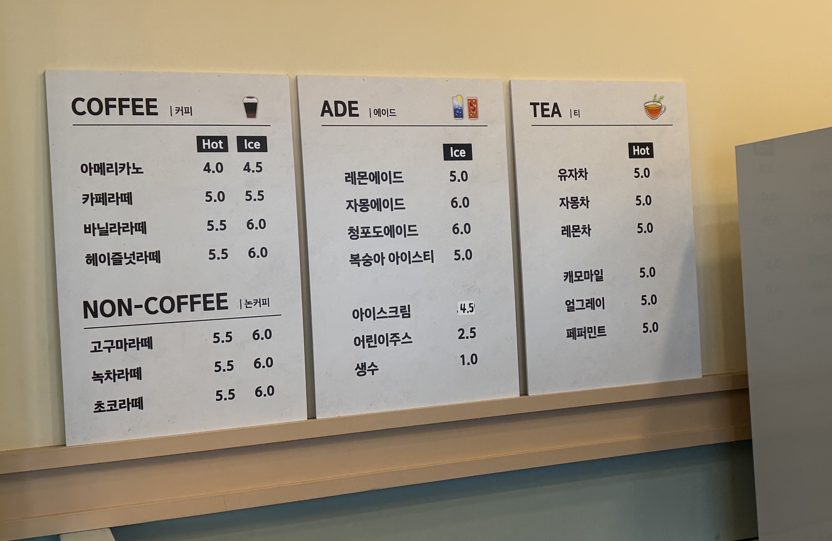 로봇아저씨 (로봇빵, 츄러스, 슬러시) / 풀하우스 (덮밥, 라면) / 카페 봄봄 (커피, 에이드, 아이스티)