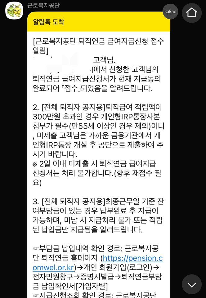 저 메시지를 받은것이 수요일이었는데 퇴직금은 다음주 금요일에 퇴직급여 IRP 계좌로 퇴직금이 들어왔어요