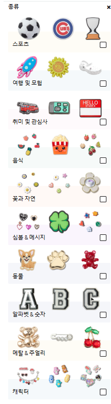 크록스 지비츠는 홈페이지에 가니 스포츠, 여행 및 모험, 취미 및 관심사, 음식, 꽃과 자연, 심볼 & 메시지, 동물, 알파벳숫자, 메탈, 주얼리, 캐릭터 등 다양한 종류의 지비츠를 만날 수 있어요~