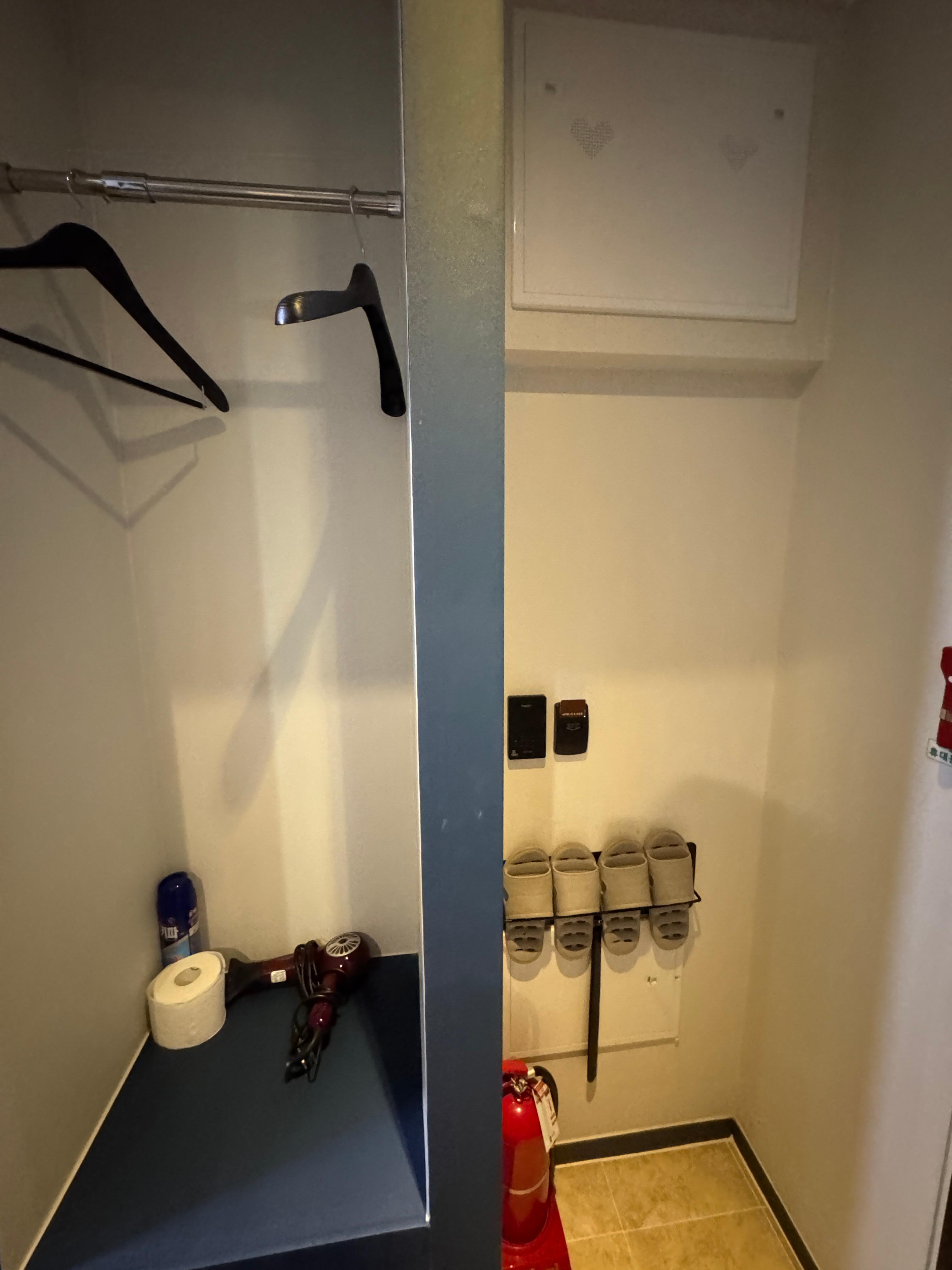 객실에는 이렇게 간이 테이블과 의자가 있어서 밖에서 먹을걸 사와서 먹을 수도 있고 옷걸이나 휴지 드라이기, 실내화 등 필요한건 다 갖춰져 있어요~