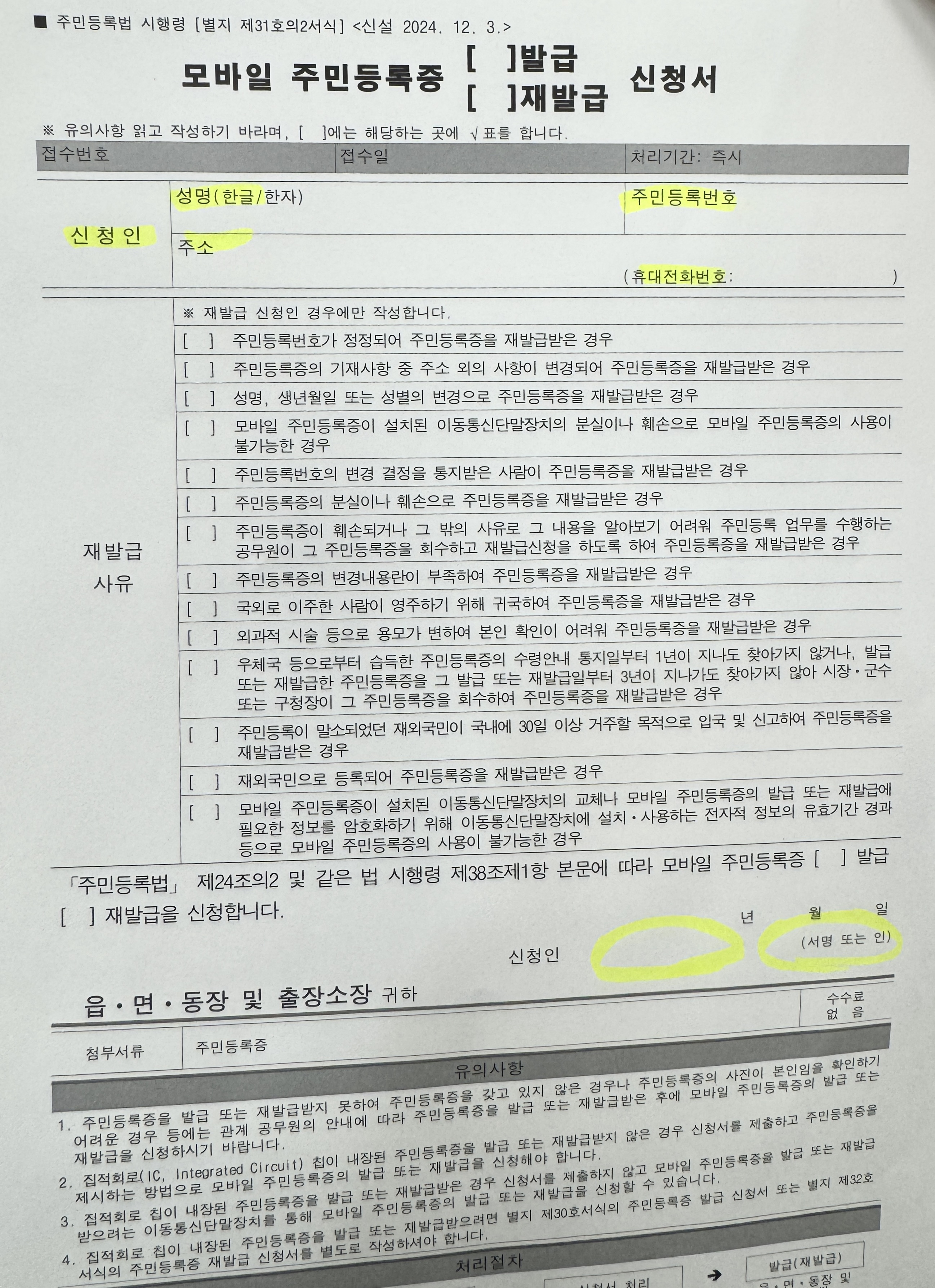 모바일 주민등록증 발급 신청서에는 신청인 성명, 한글/한자, 주민등록번호, 주소, 휴대폰 번호, 서명 등을 해주면 된답니다 ~ 이렇게 신청을 하니 공무원 담당자님이 어플을 받으라고 안내해주셨어요~
