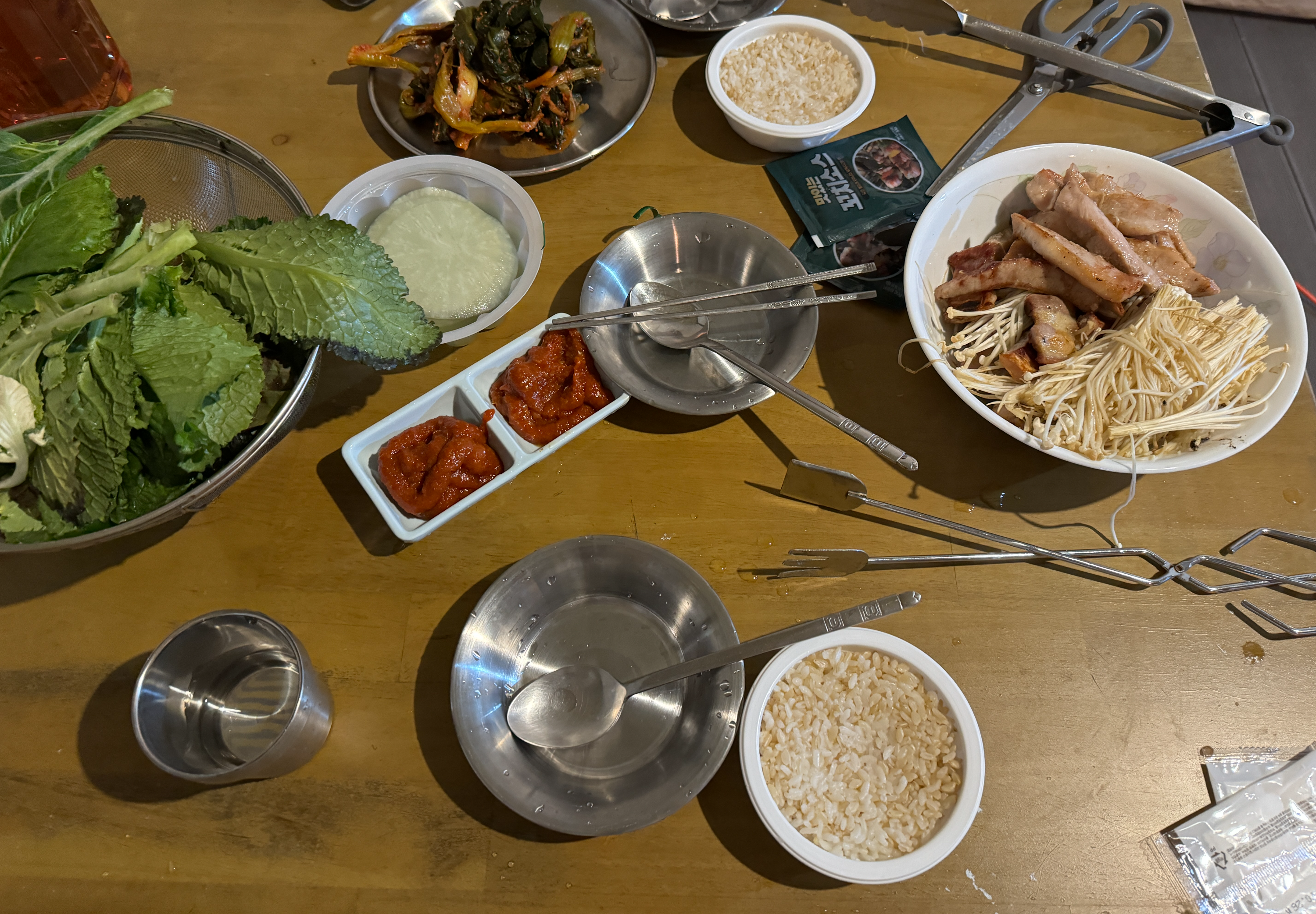 장봐온 고기인 항정살과 삼겹살 그리고 밥, 쌈무, 쌈장, 파김치까지 다양하게 먹어서 좋았어요