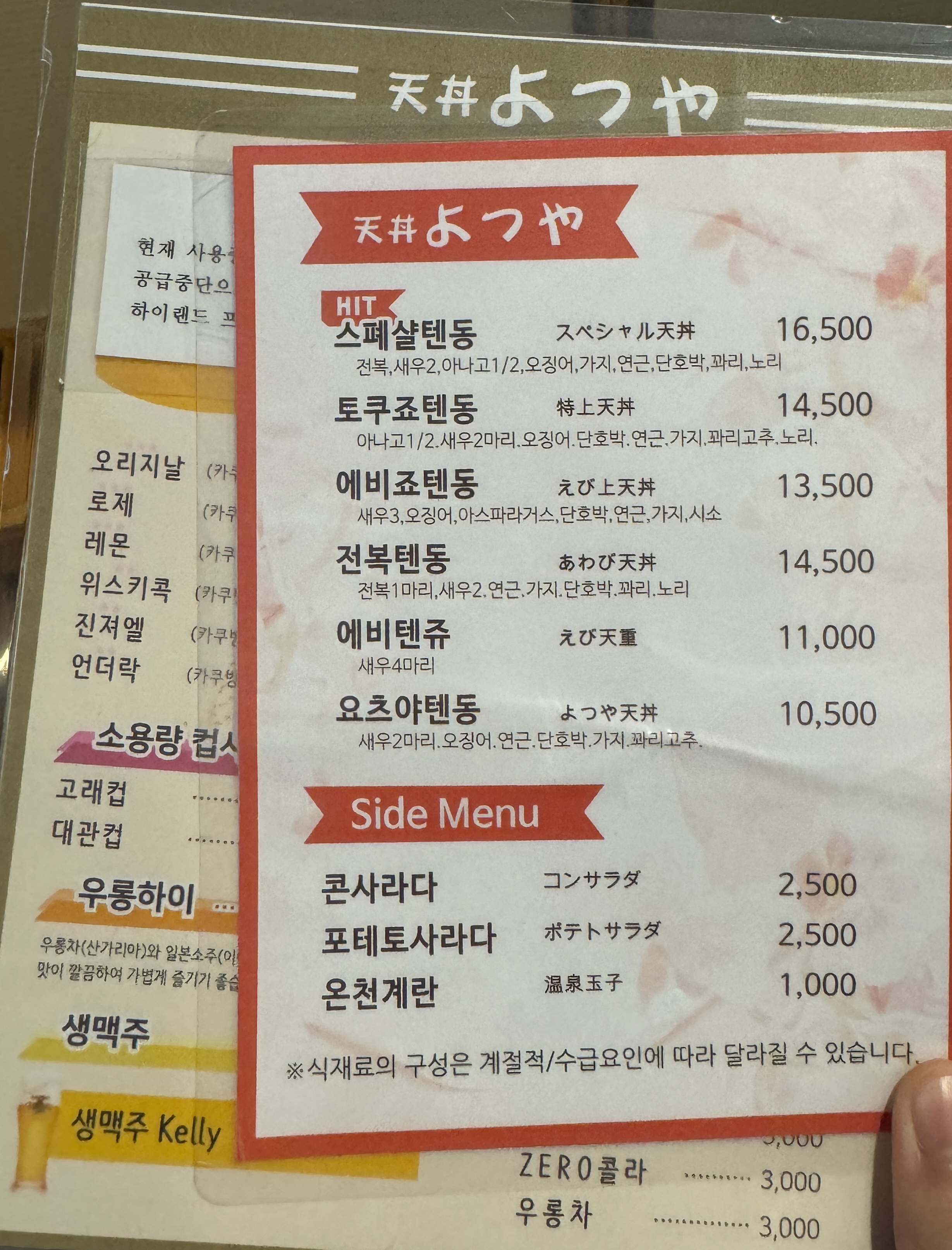 할명수 샤로수길 텐동 맛집 샤로수길 텐동 맛집 텐동 요츠야 메뉴판이에요