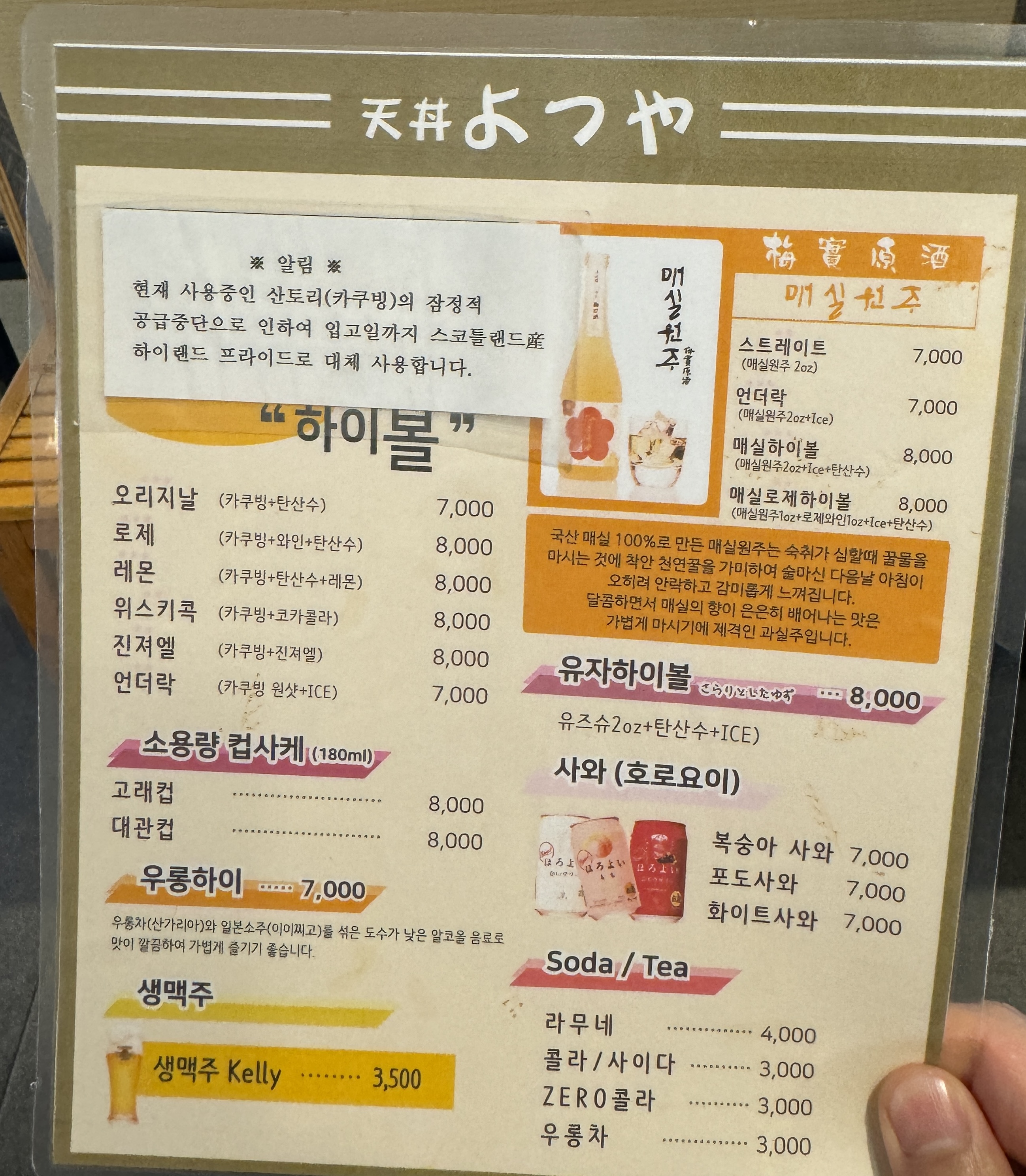 오리지날, 로제, 레몬, 위스키콕, 진져엘, 언더락 등이 있고 컵사케나 우롱하이, 생맥주, 사와, 매실원주, 유자 하이볼 등 다양한 음료들이 있어요~