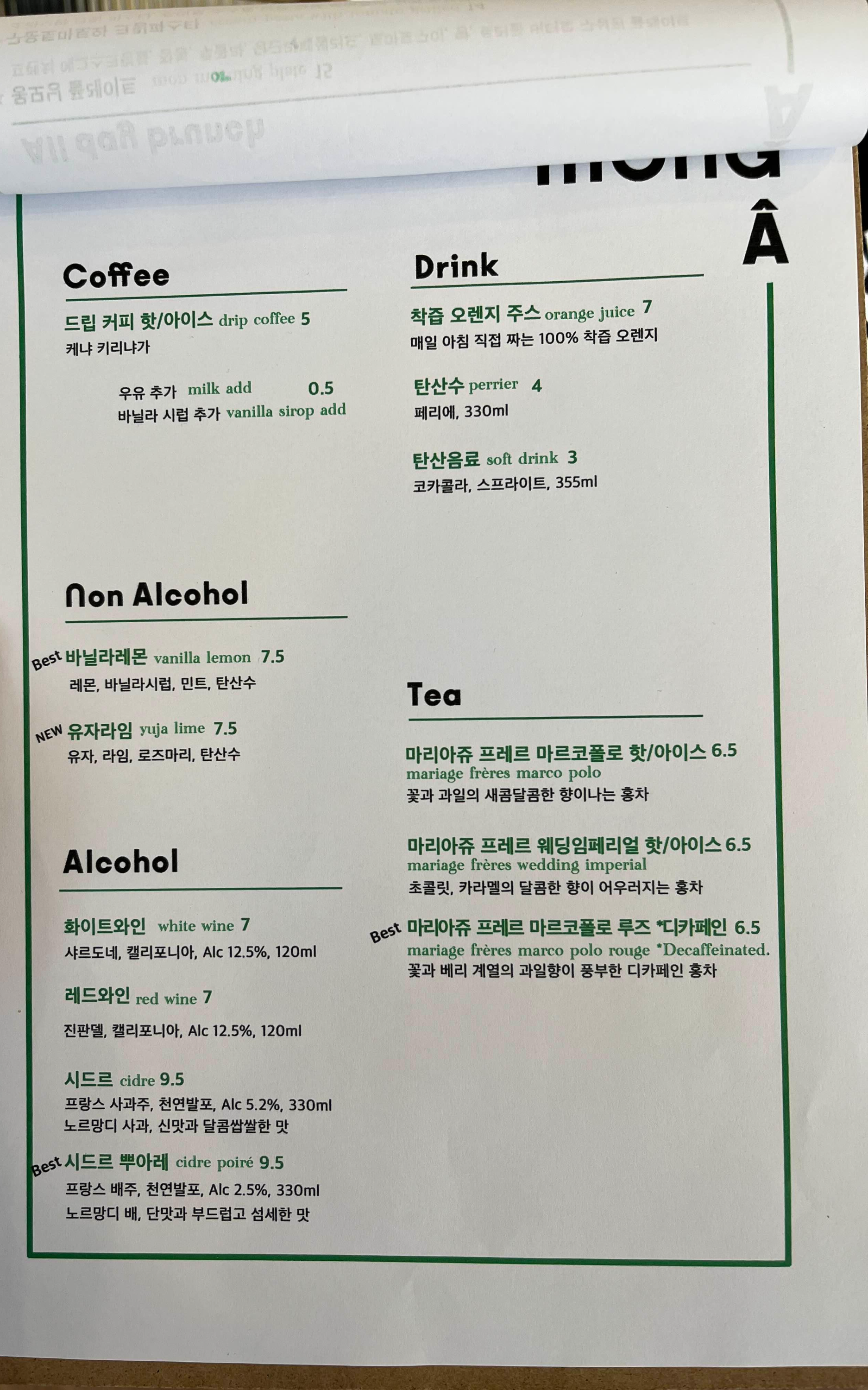 석촌호수 맛집 석촌호수 브런치 맛집 석촌호수 뷰 맛집 몽가 잠봉뵈르 어니언 스프 파스타 맛집의 메뉴판이에요~
