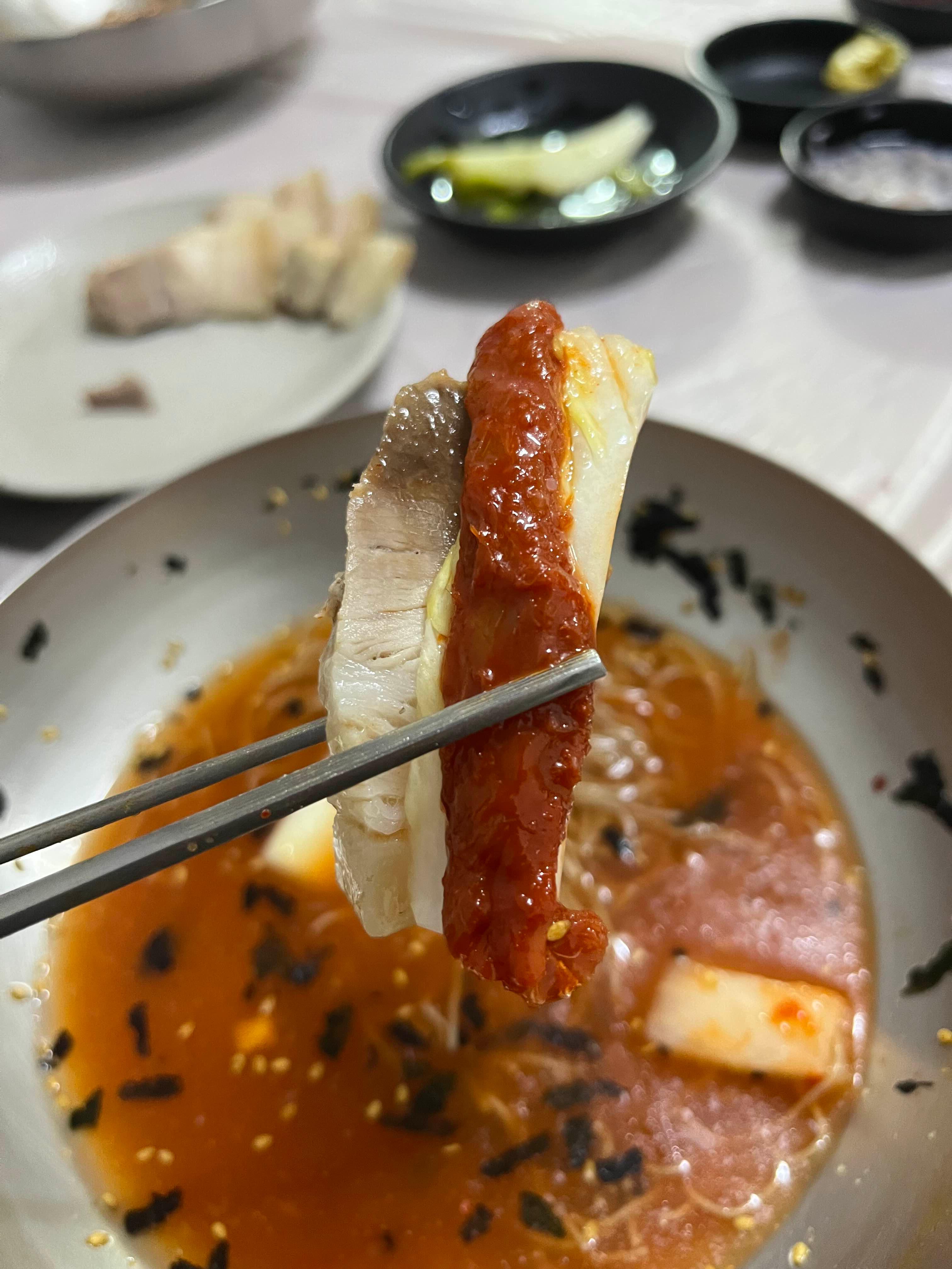 수육은 비계와 살코기가 고루 들어있는 느낌이었고 함께 먹을 수 있는 백김치와 먹어도 맛있었어요