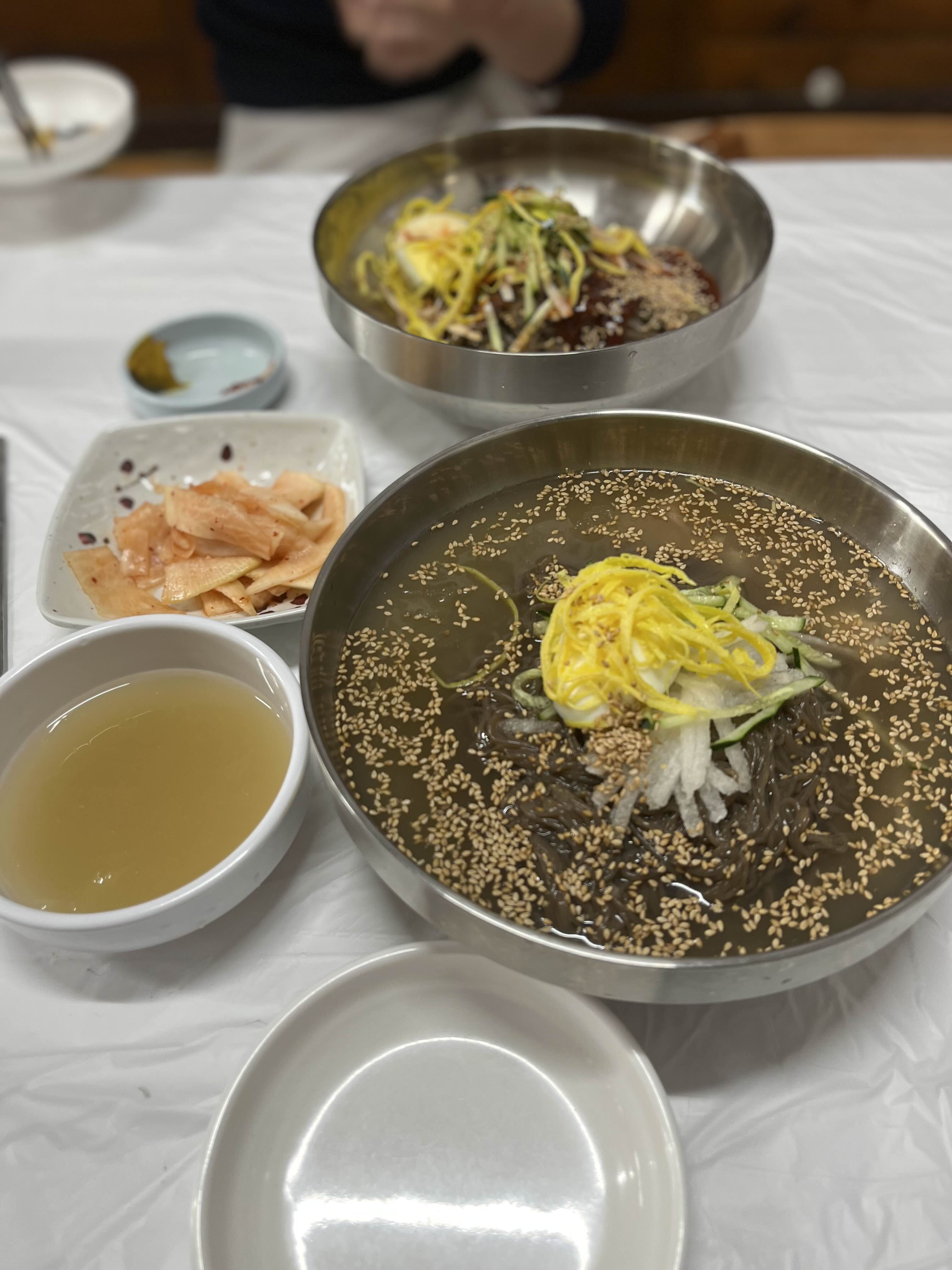 군산 냉면 맛집 군산 평양냉면 생활의달인 맛집 멧돌방식당 군산 맛집에서 물냉면과 비빔냉면 하나씩 주문을하면 이렇게 육수 그릇과 함께 겨자 다대기 무침 반찬하나를 내주셨어요~