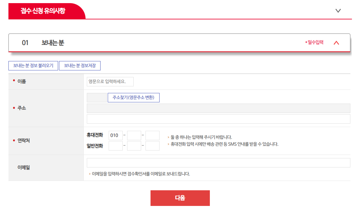보내느 사람의 정보를 영문 주소로 변환한것으로 다 적어줬어요