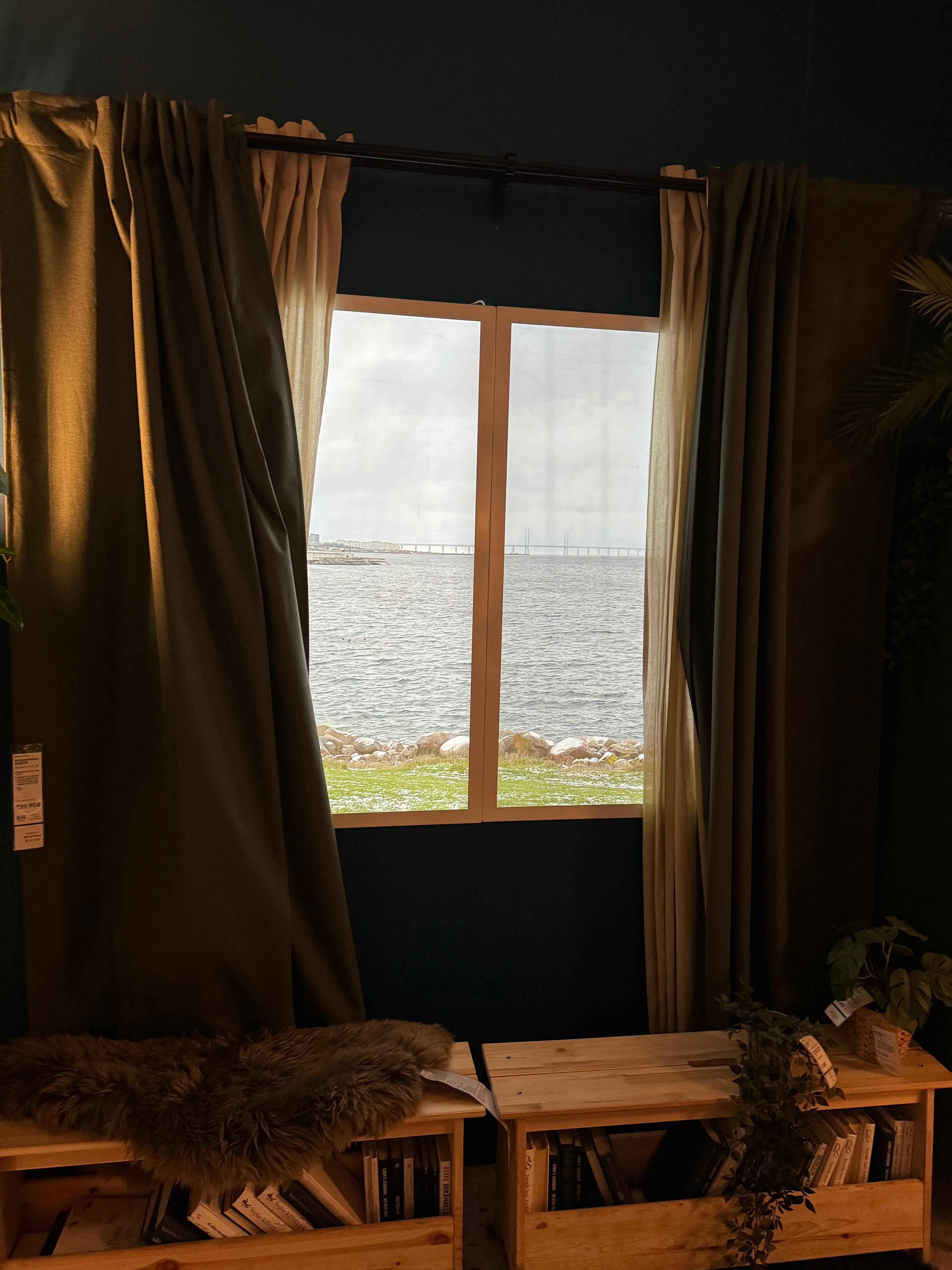 커튼도 색감이 약간 카키 계열 느낌이었는데 분위기도 좋고 커튼을달게된다면 저런 어두운 톤으로 해서 뭔가 꾸며놓은 바깥 바다풍경이 너무 잘어울렸어요~ 우리집이바로 앞에 바다였으면 하는 마음이 들더라구요~