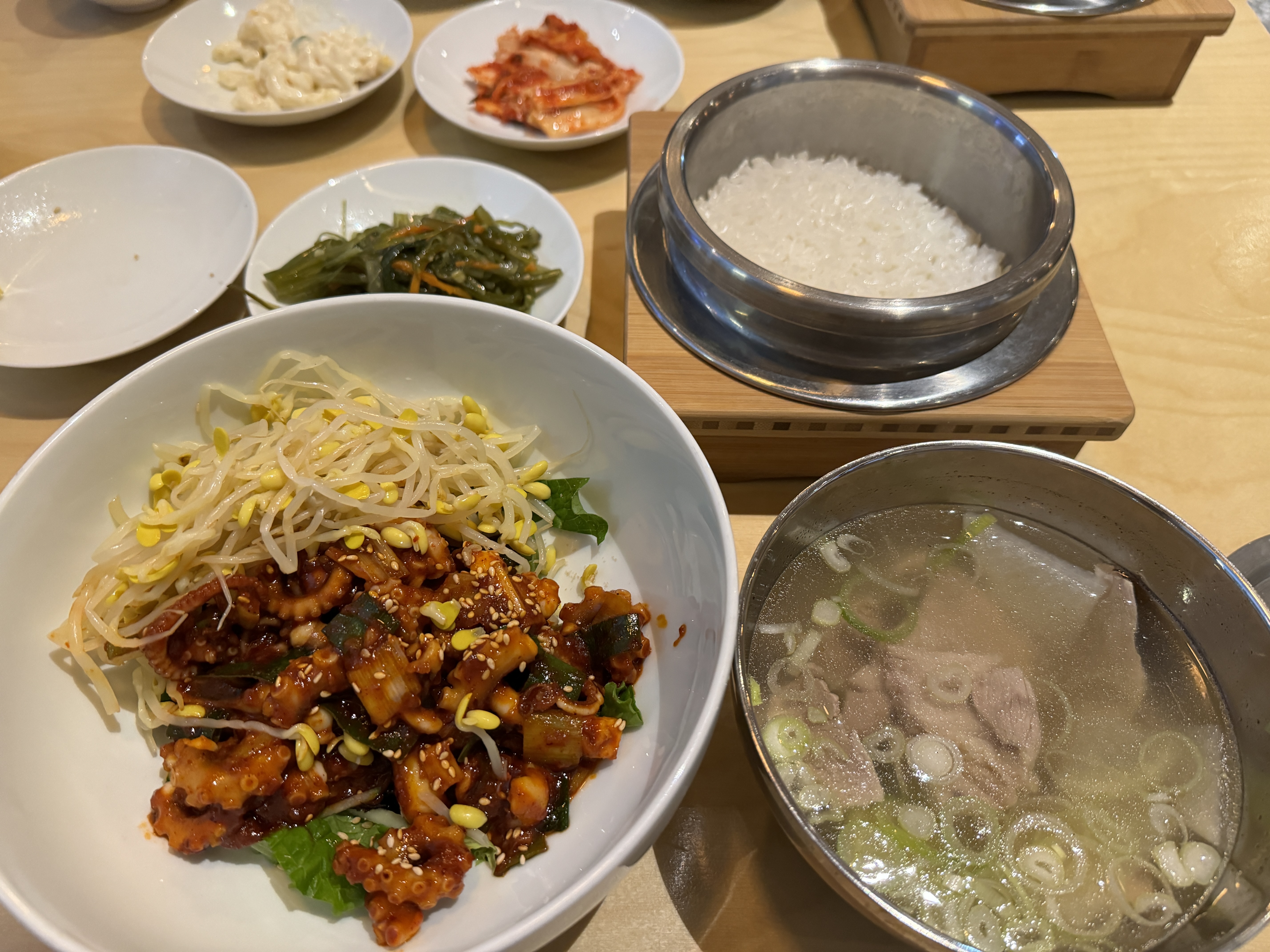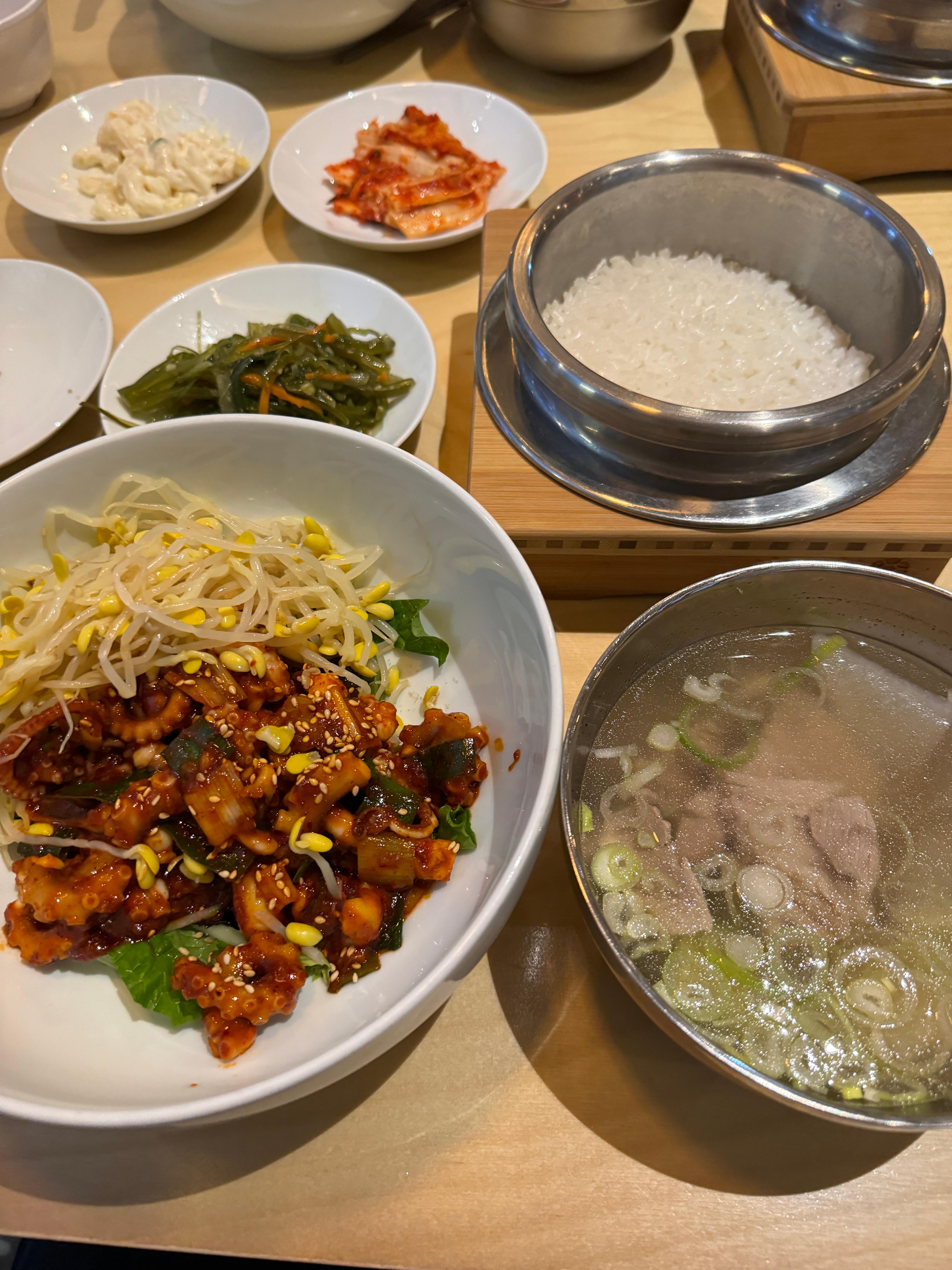 밑반찬과 돌솥밥 그리고 콩나물 낙지볶음 맛있는 고기국까지~