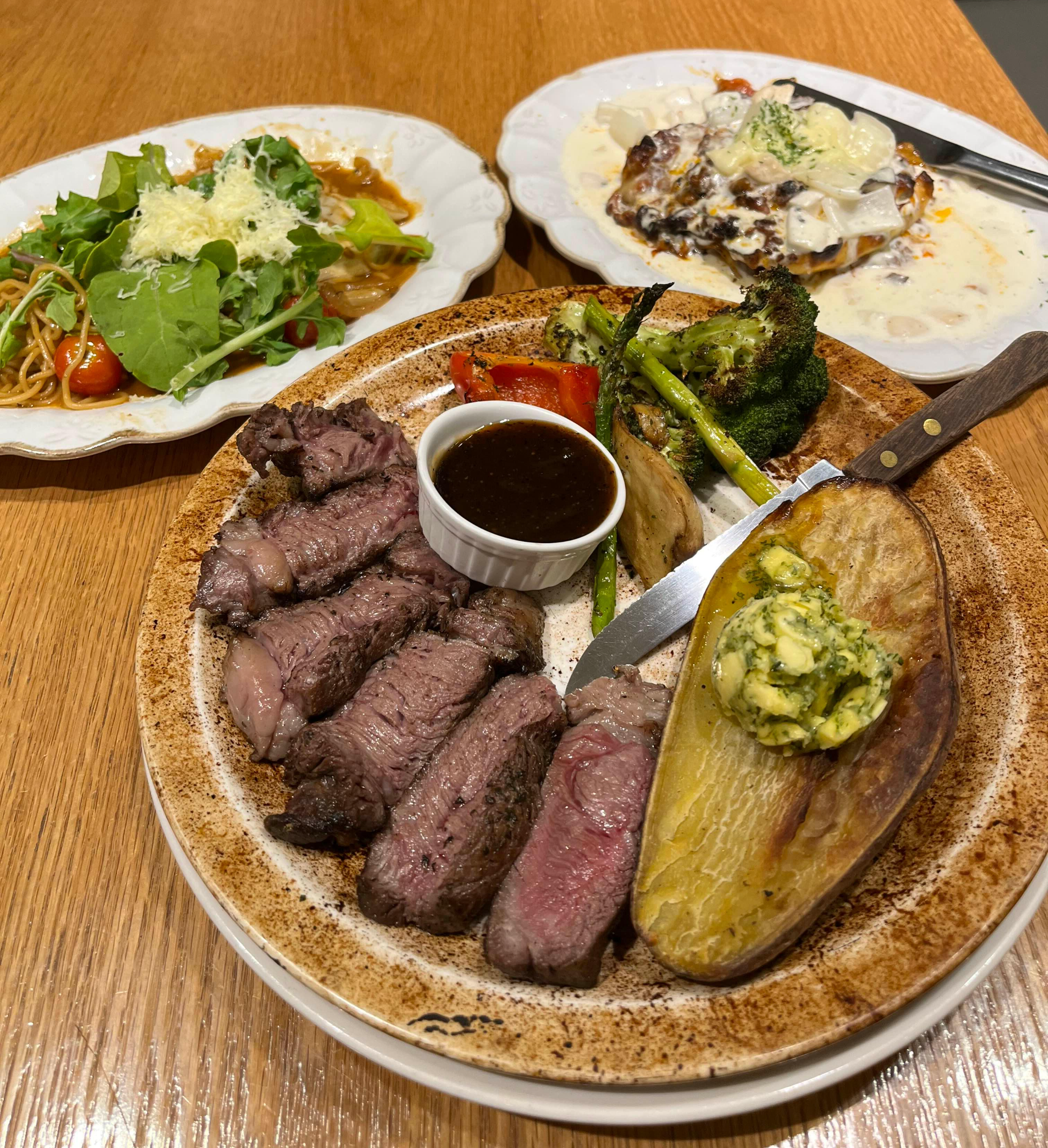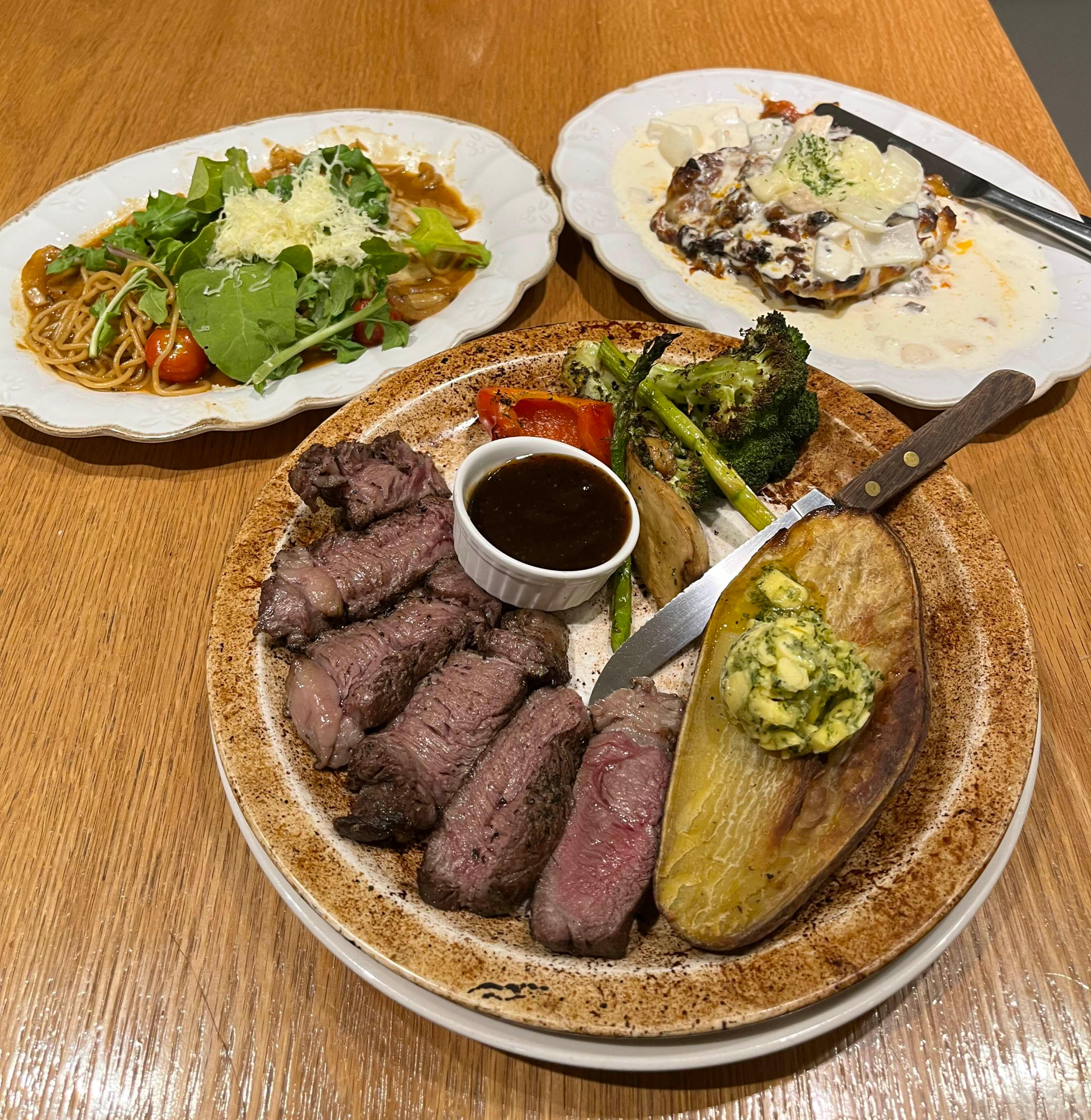 스테이크는 등심, 비프 스테이크 두가지가 있는데 같이 나오는 사이드메뉴 2가지를 선택할 수 있어요~
