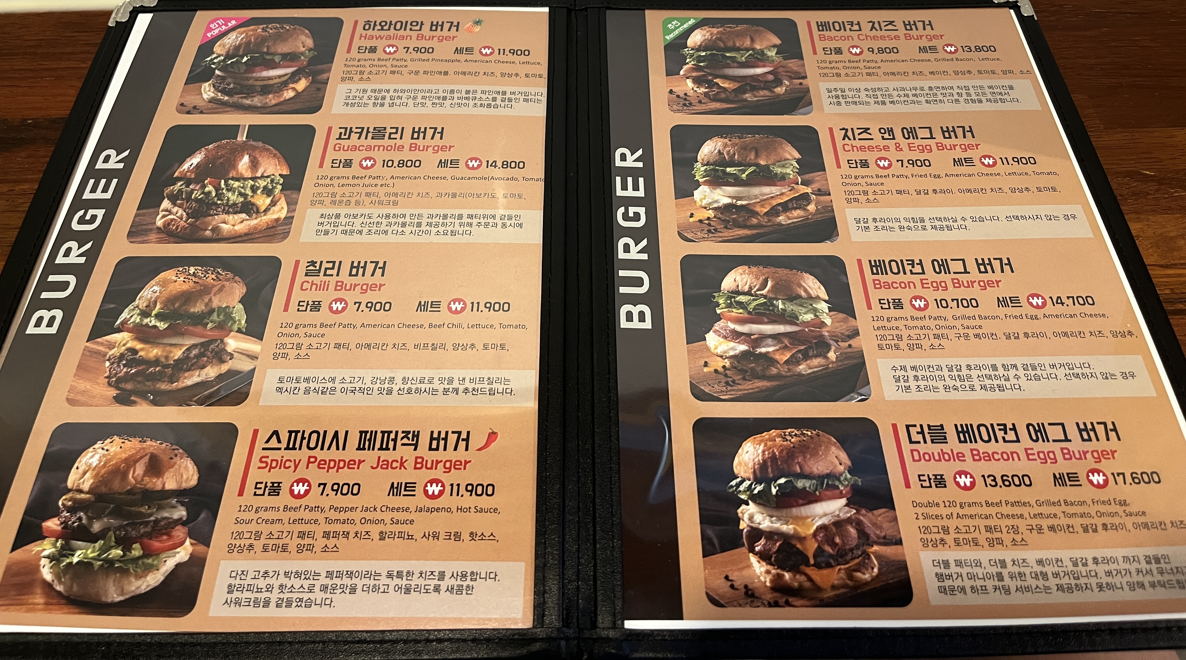 그외에 햄버거는 하와이안버거, 칠리버거, 스파이시페퍼잭버거, 더블베이컨에그버거, 베이컨 에그버거, 치즈앤 에그버거, 베이컨 치즈 버거 등 버거종류가 정말 다양하네요~