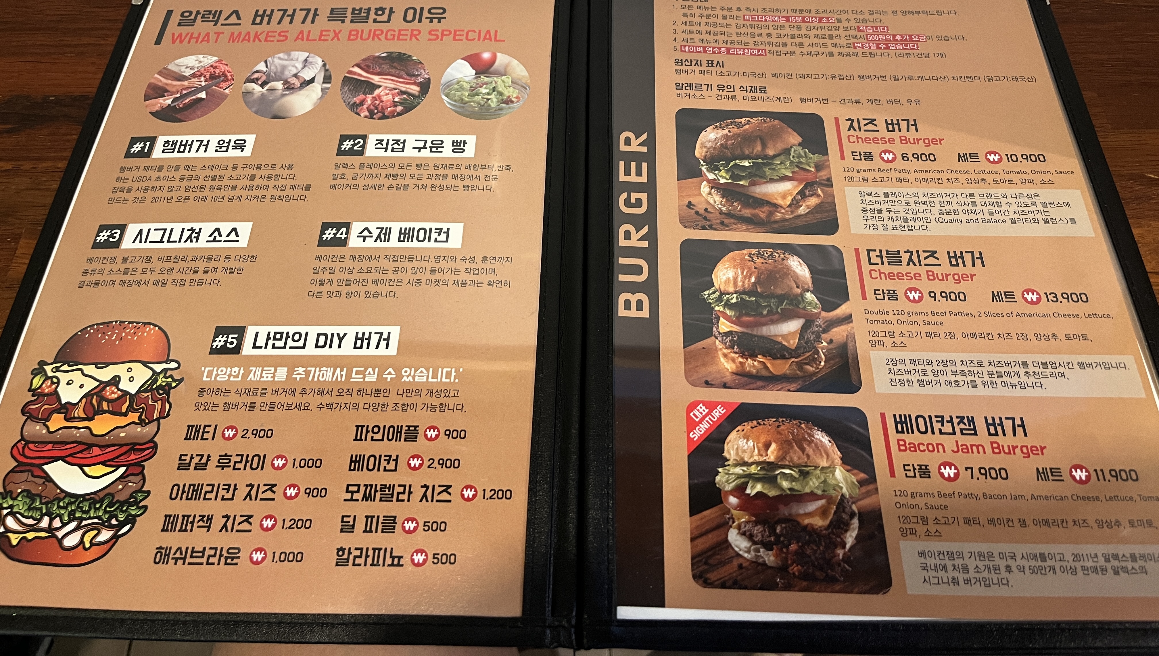 보라매역 수제버거 맛집 알렉스 플레이스 메뉴판이에요~