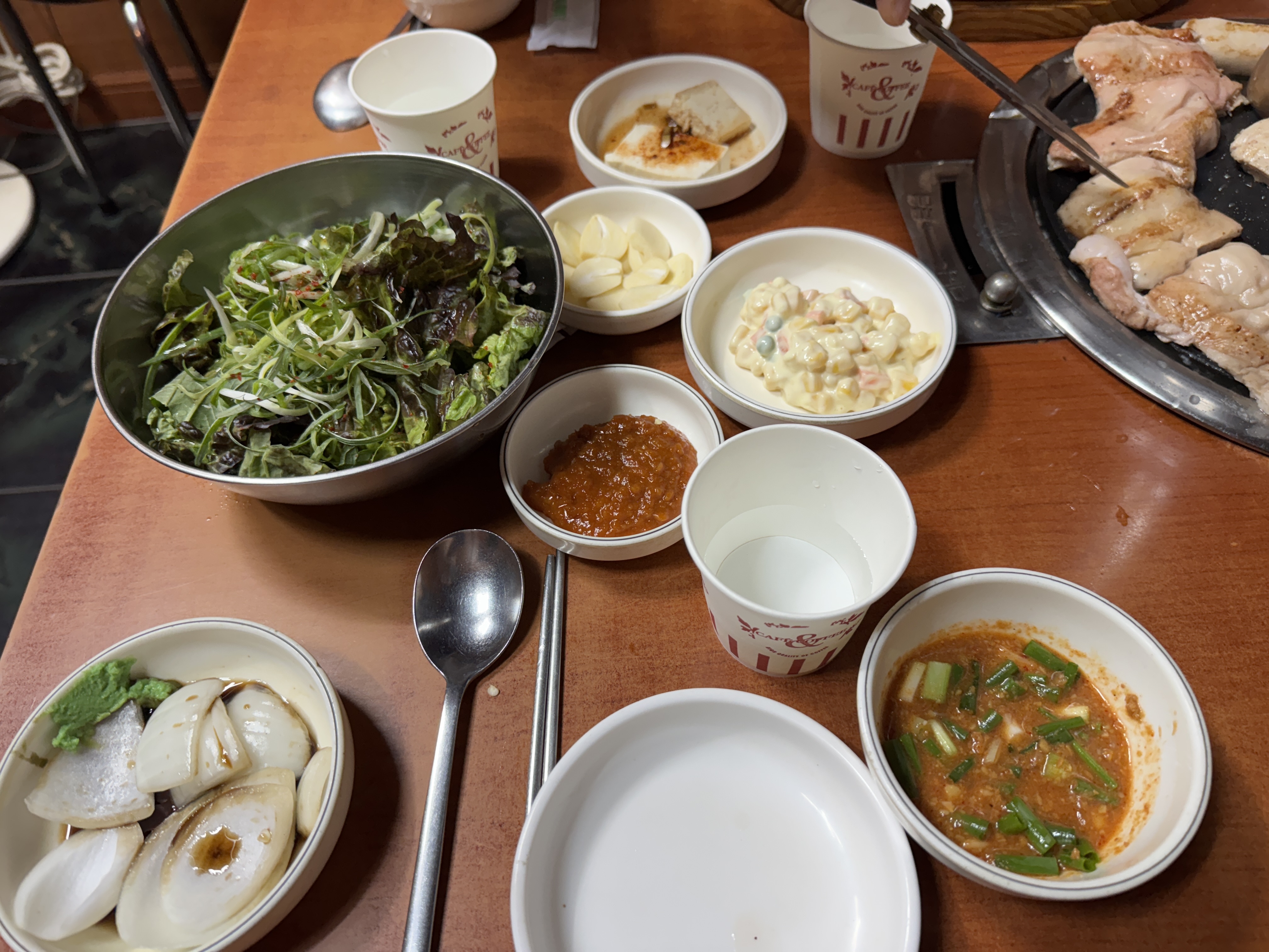 불판도 숯불이기때문에 향도 그윽하게 나고 같이 나온 겉절이 샐러드 두부조림 마늘 양파장이 나왔어요~