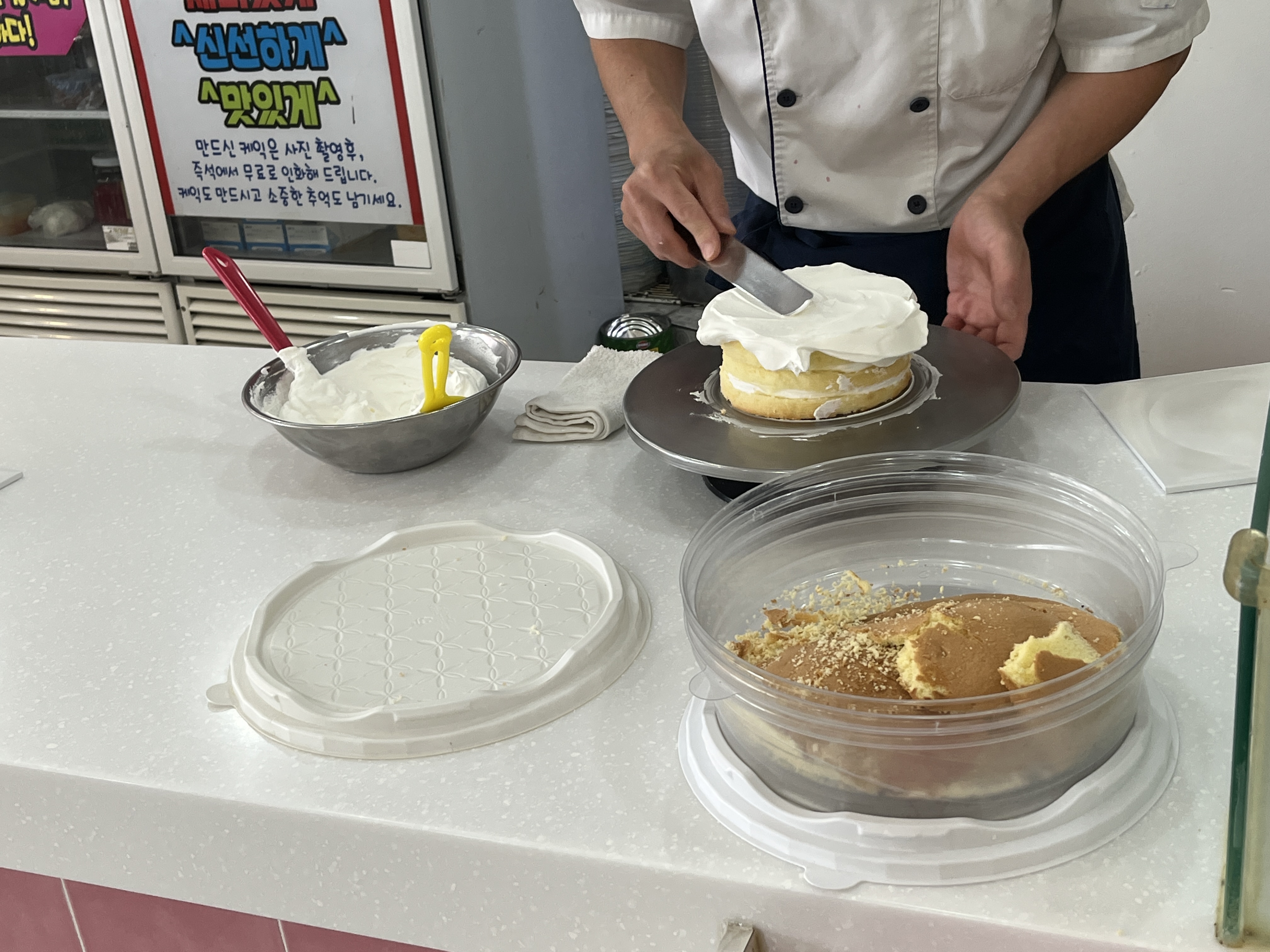 도착을 하니 케이크 2개를 주문드렸고 그자리에서 바로 생크림을 발라서 케이크 베이스를 주셨어요~