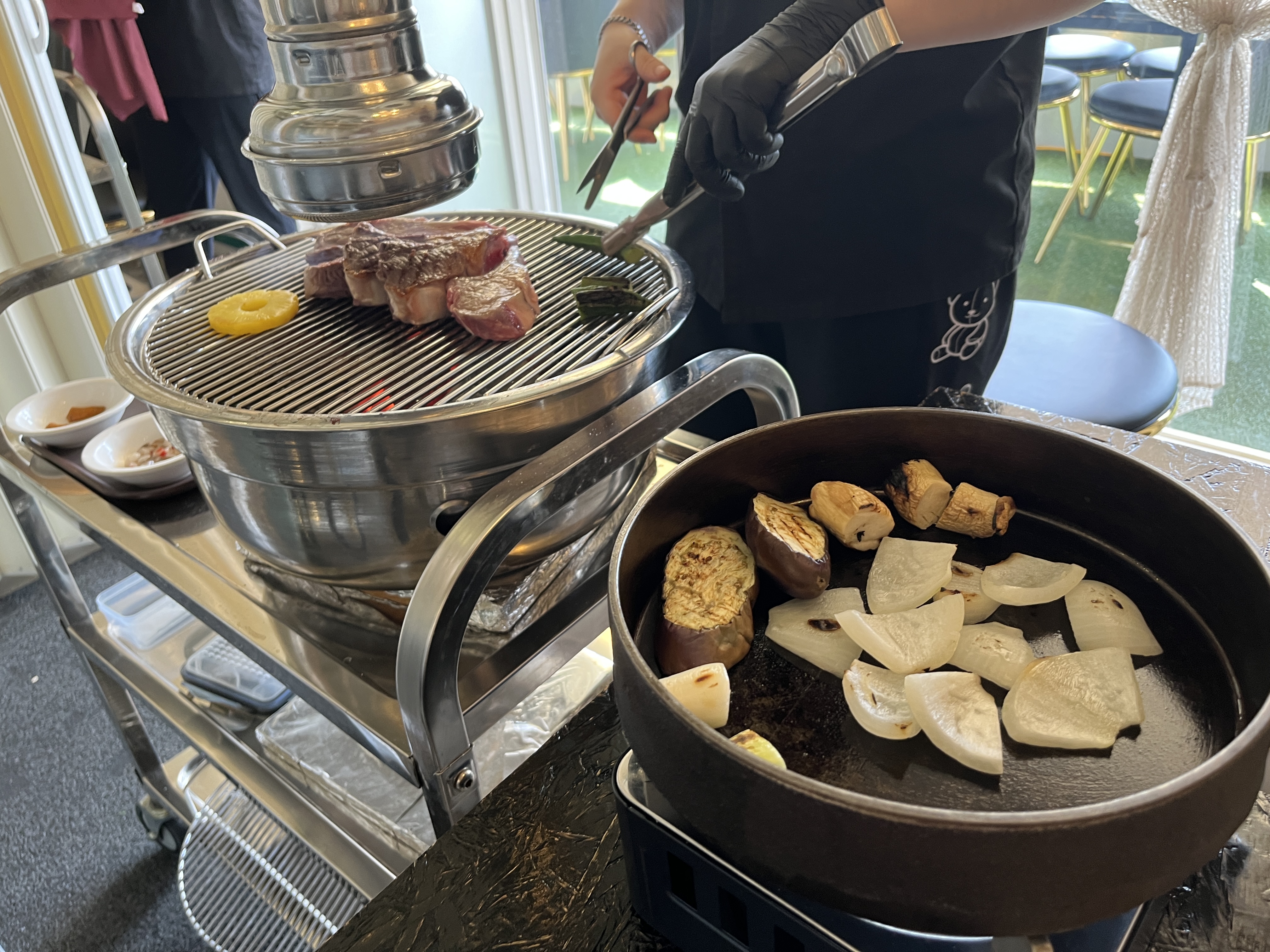 처음에 이렇게 화로에 굽고 야채나 가지 양파는 테이블에 있는 버너냄비위에다가 따로구워주고 계셨어요~