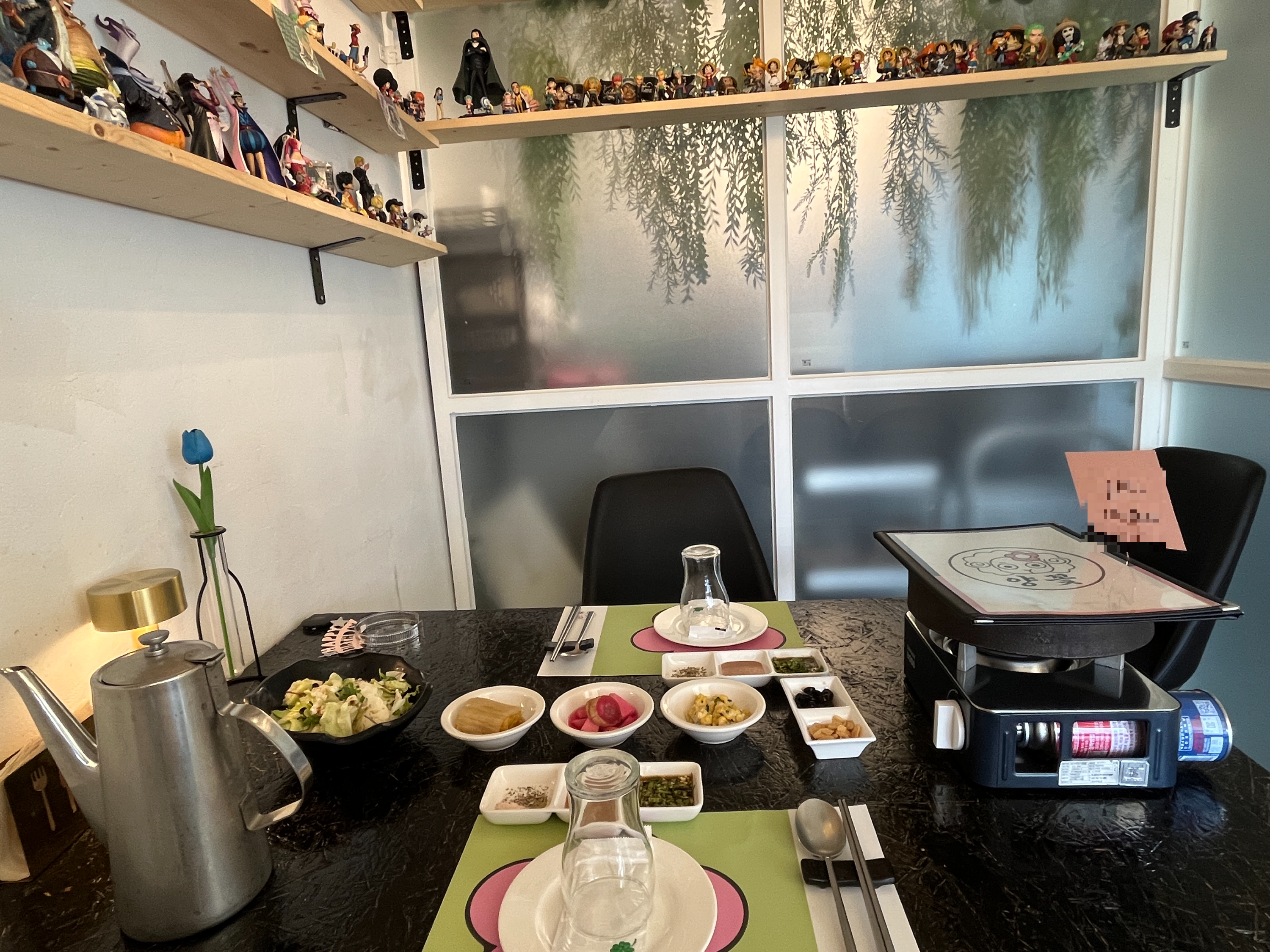 테이블마다 귀여운 꽃모양의 종이가 깔려져있고 접시 등도 가지런히 준비되어있어요~