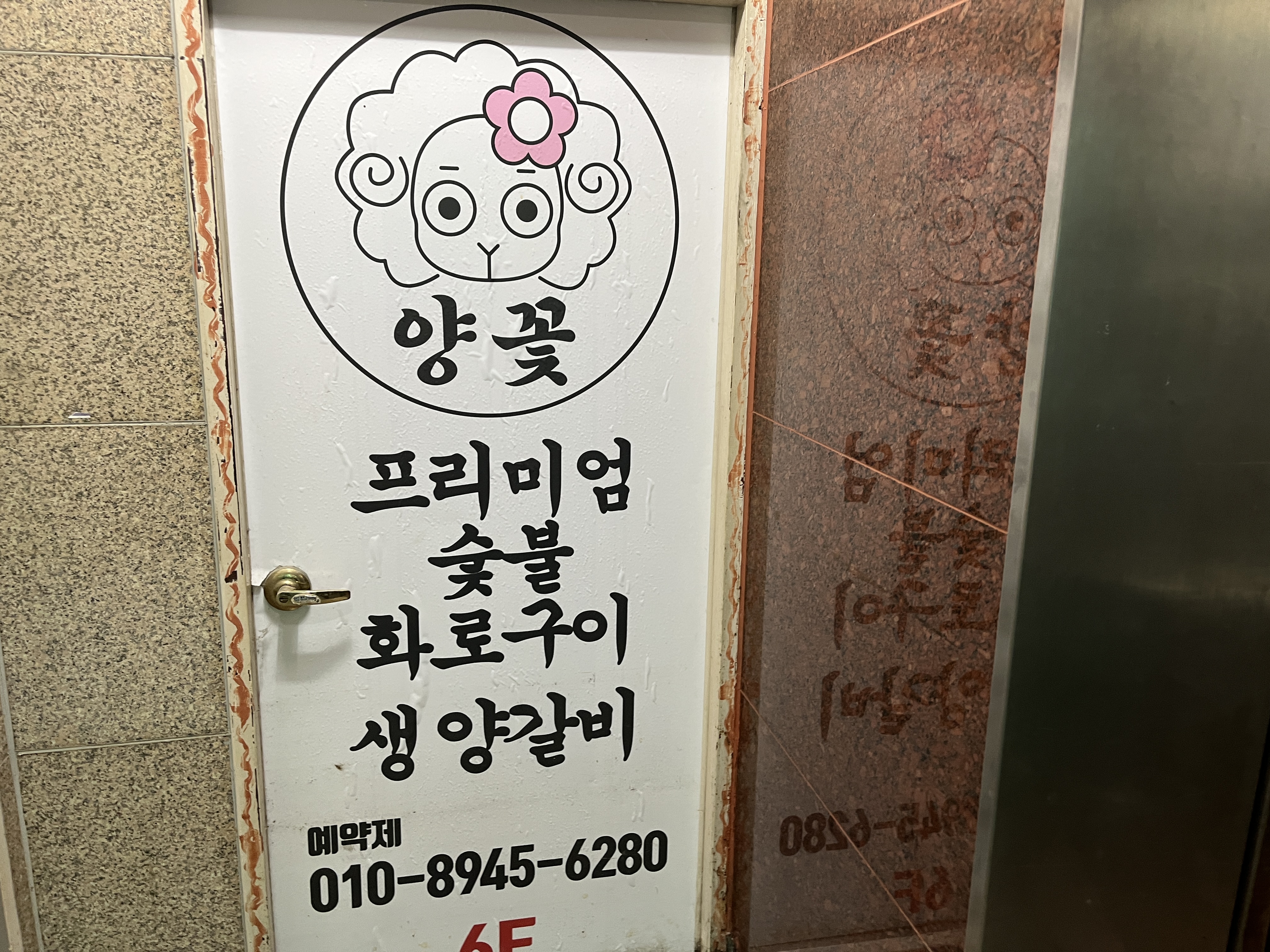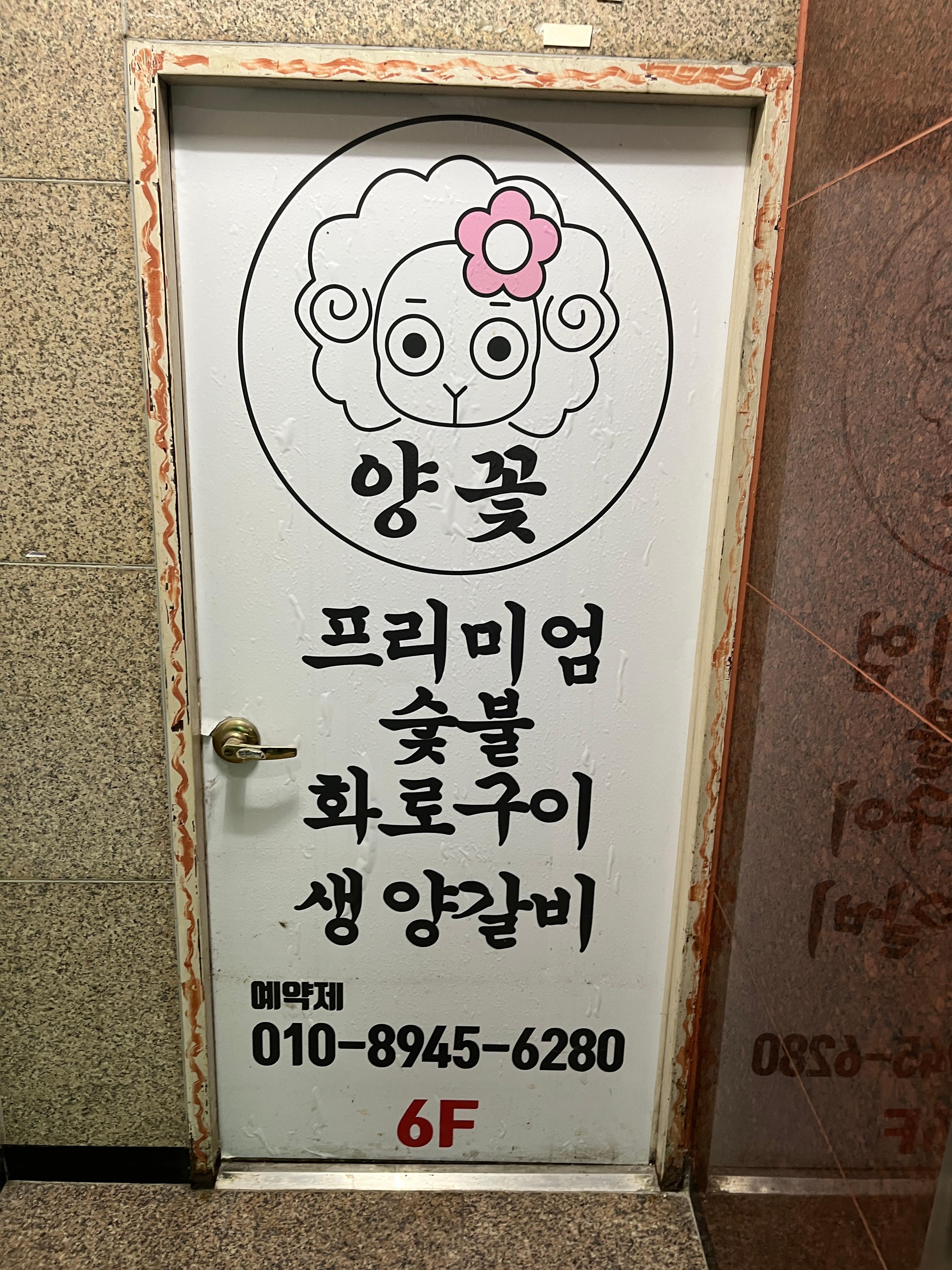 6층에 테라스, 룸, 텐트룸이 있는 프리미엄 양갈비 전문점 양꽃의 시그니처 단품메뉴 주문 시 일대일 서비스로 이루어지는 4종 오마카세 램마호크를 무한으로 즐기며 구워드리는 서비스로 편하