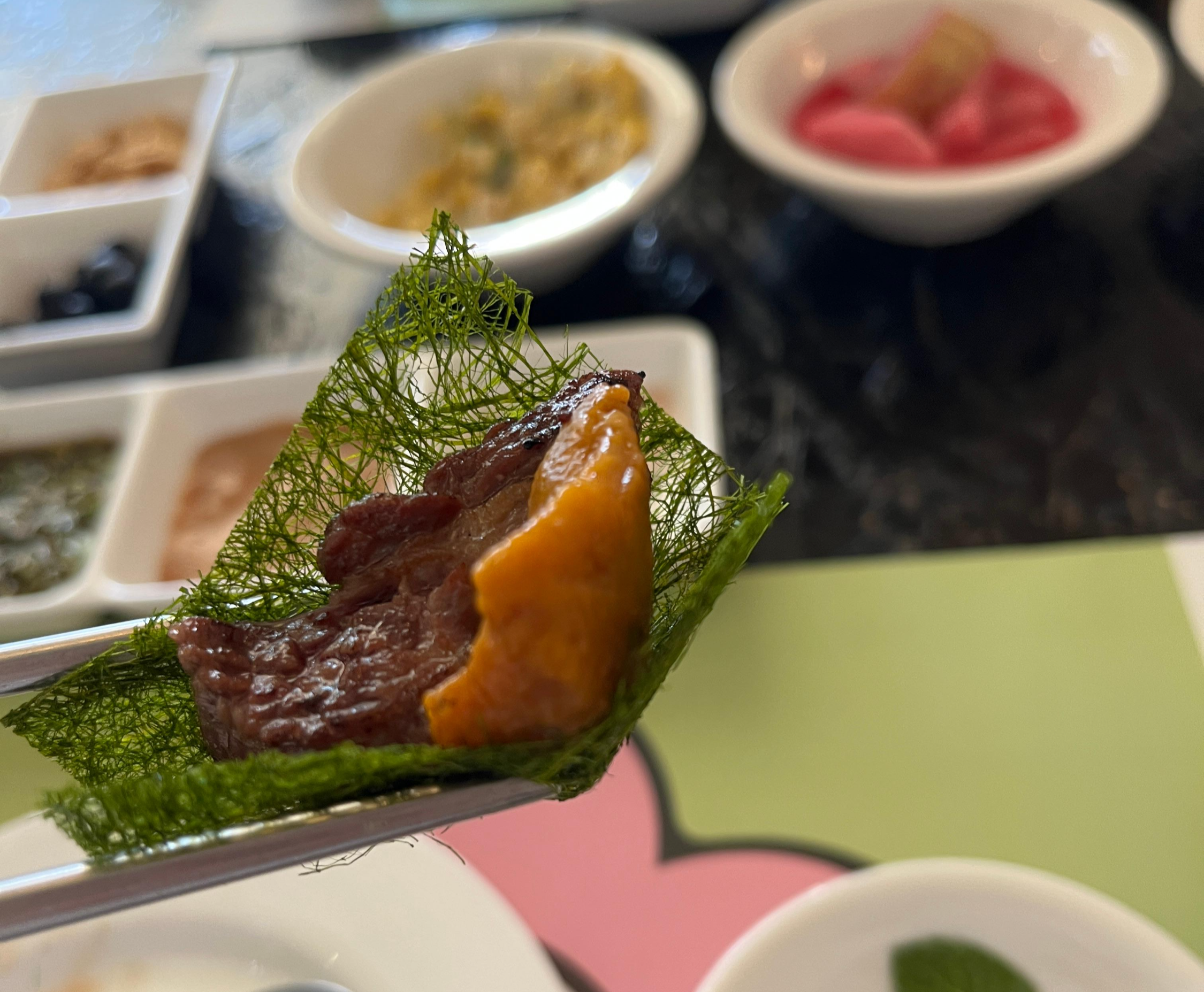 양고기 오마카세 양꽃 강남본점 논현 양갈비 맛집 논현 양갈비 논현 양갈비 맛집 프렌치랙 숄더랙 맛집에서 먼저감태와 우니에다가 함께 곁들여서 싸주셨어요~ 우왕~ 입에서 감태와 우니가 살살 녹으면서 감칠맛도 나고바다맛도 나면서 입에서 고기도 녹은 느낌이랄까요~ 맛있었어요~ 우니와 감태가 나올줄은 몰랐는데 이곳의 매력은 바로 다양함이에요~
