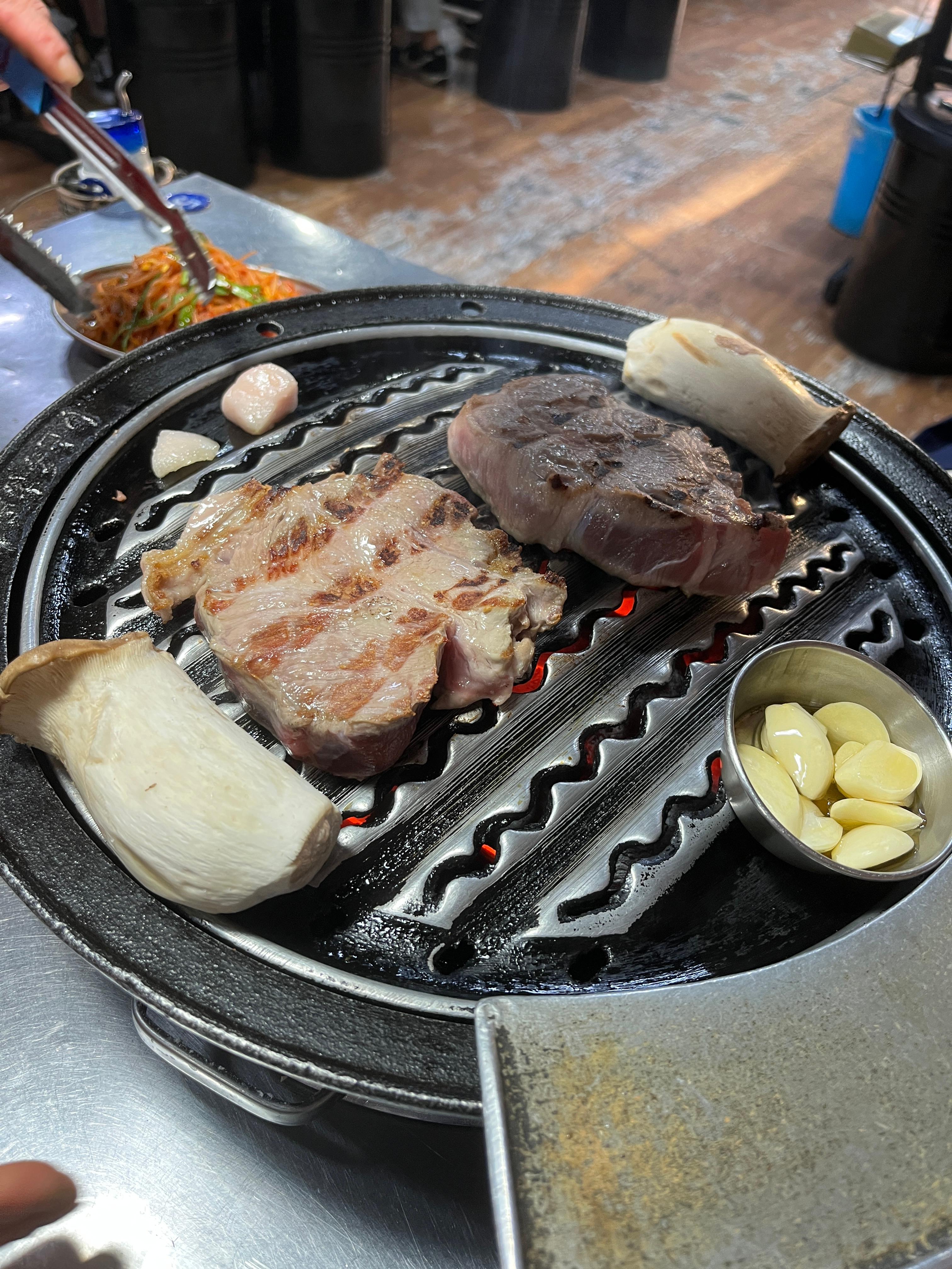 불판도 독특한 지그재그 느낌이에요~ 게다가 버섯과 마늘까지 은은하게 익어줬어요~