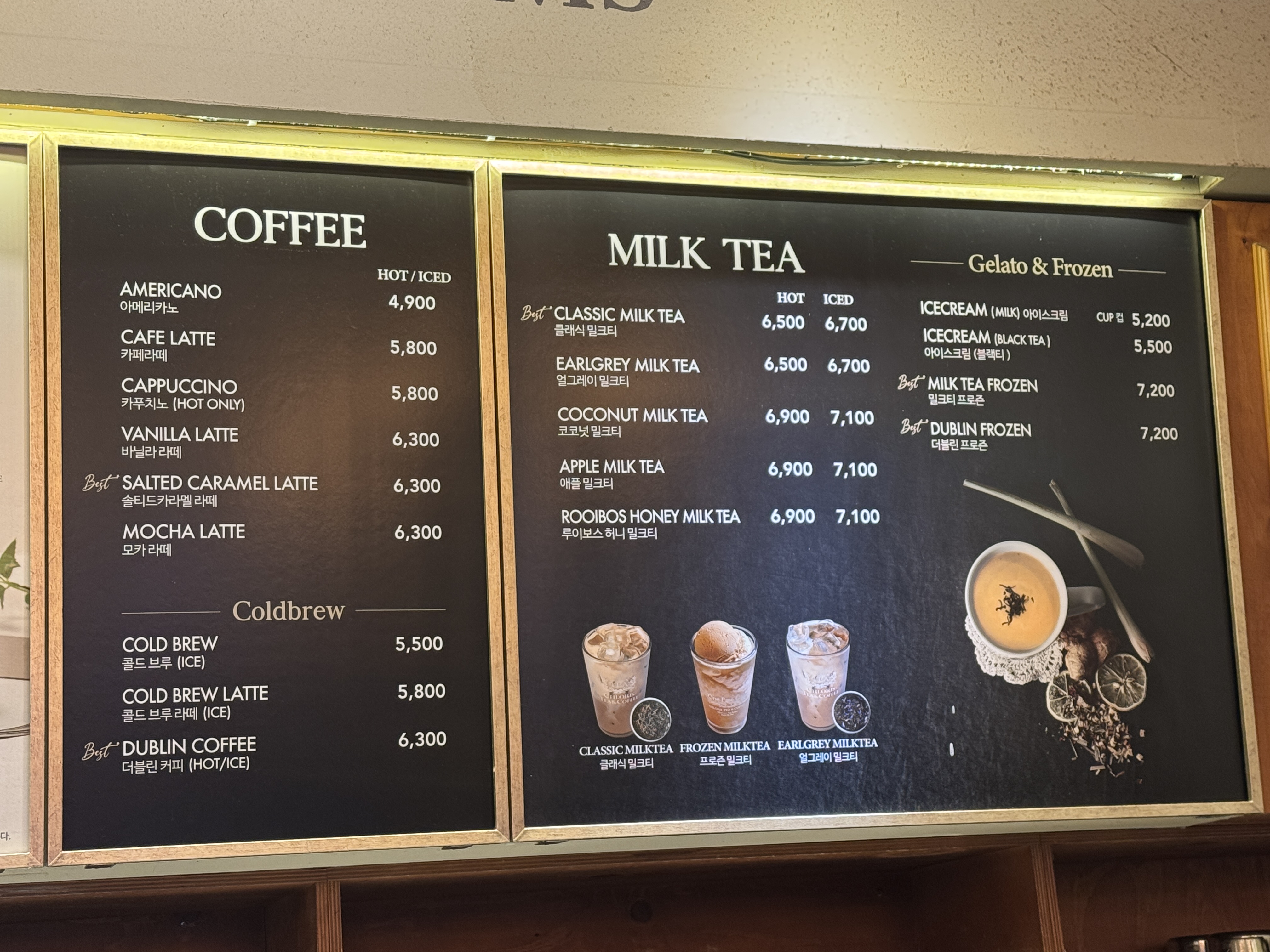 얼그레이 코코넛 밀크 프로즌, 라벤더 라임 티 에이드 등이 보이네요~ 실내 분위기도 고급스럽고 밀크티 종류에서도 정말 세분화되어 다양한 메뉴들이 있었어요~