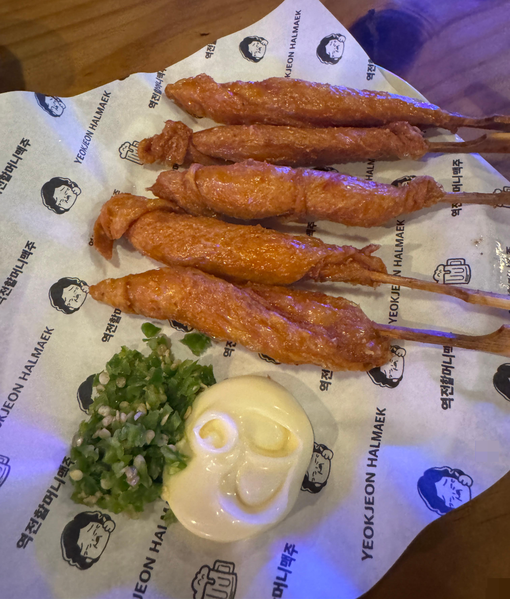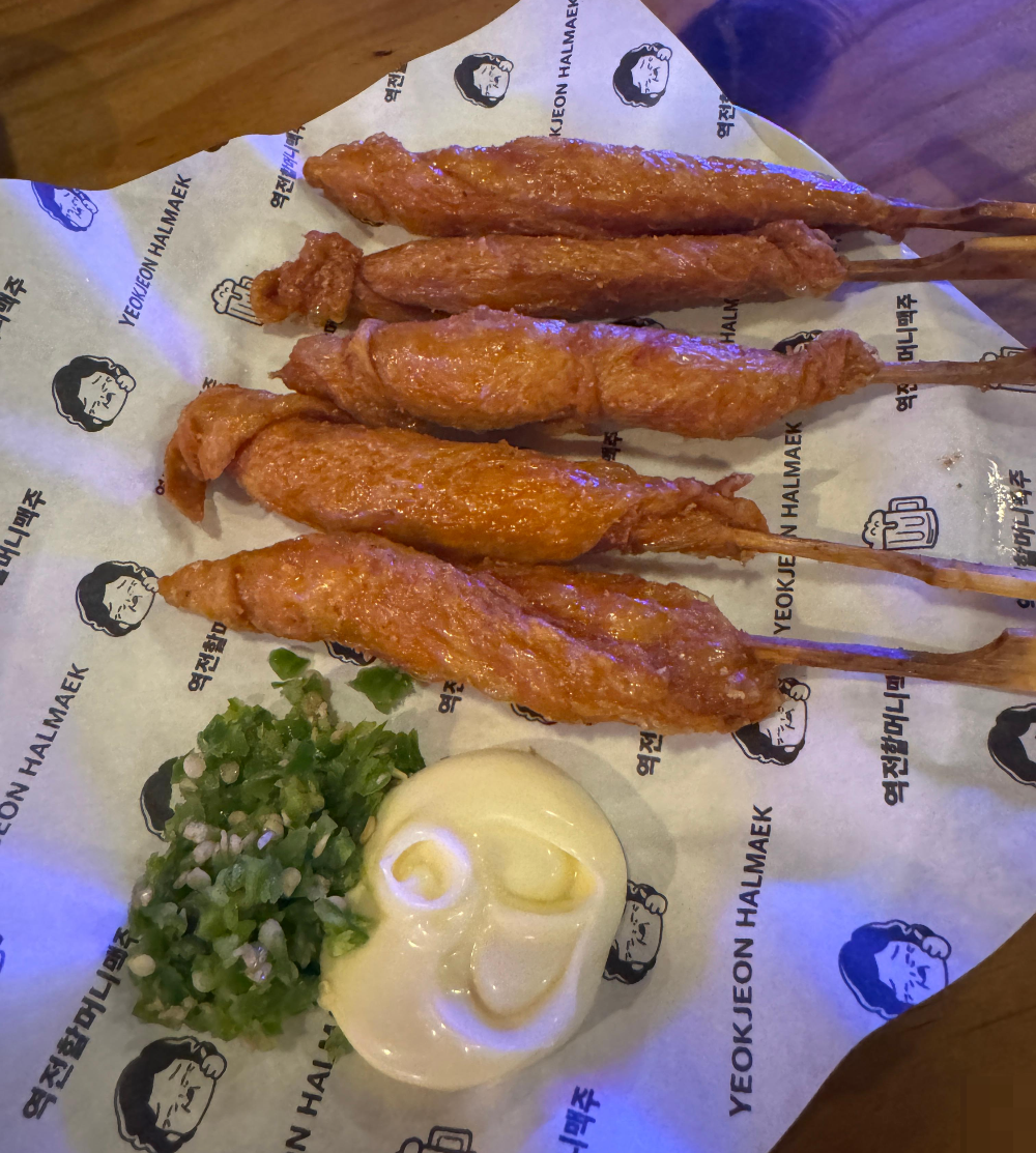 낙성대역 맥주집 낙성대 술집 낙성대 맥주 맛집 역전할머니맥주 서울낙성대역점의 닭껍질 교자 꼬치가 나왔는데요