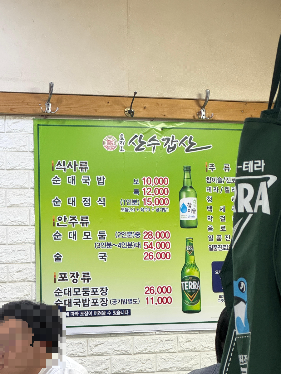 을지로 최자로드 맛집 모듬순대 순대국 맛집 산수갑산 을지로 맛집 추천 메뉴판에는 순대국밥 보통 10000원, 특 12000원이랍니다~ 게다가 순대정식 1인분 15000원이고 순대모듬 2인분 29000원, 3-4인분 54000원, 술국 26000원
