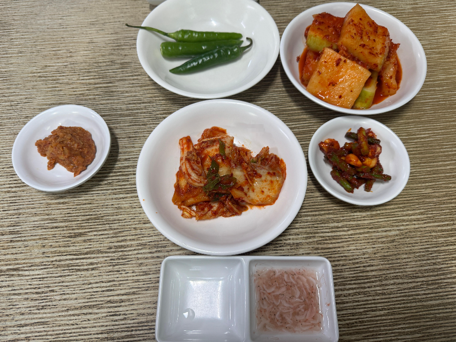 주문하니 쌈장 김치 깍두기 마늘쫑볶음 고추 새우젓까지나왔답니다